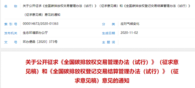 為貫徹落實(shí)黨中央、國務(wù)院關(guān)于建設(shè)全國碳市場的決策部署,我部組織起草了《全國碳排放權(quán)交易管理辦法(試行)》(征求意見稿)和《全國碳排放權(quán)登記交易結(jié)算管理辦法(試行)》(征求意見稿),于11月2日起征求有關(guān)單位意見并公開征求社會(huì)意見。