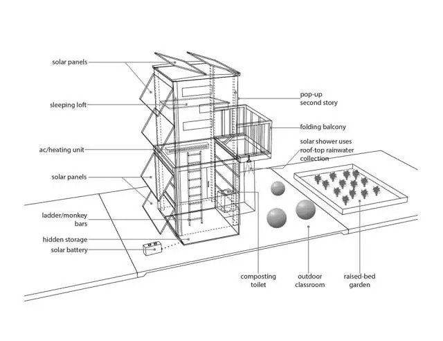 屋頂設計成三角形,不僅可以自由移動給室內通風,還內藏太陽能發(fā)電板。