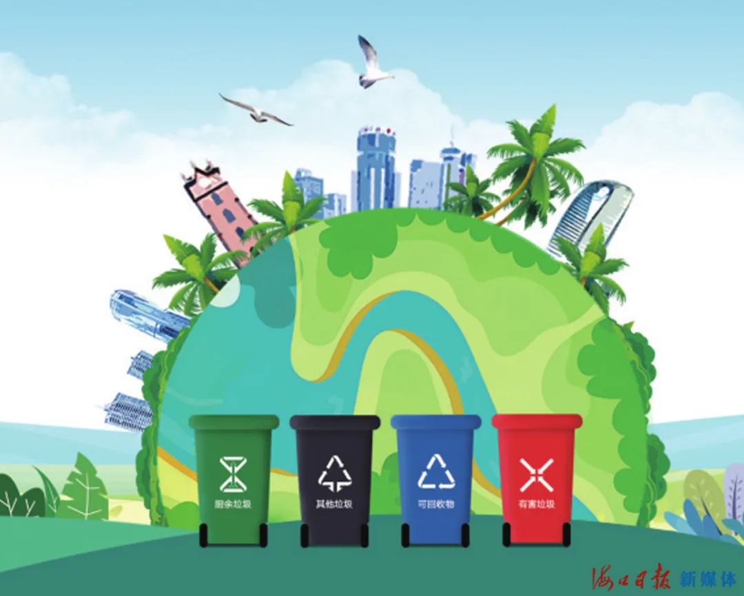 海口市生活垃圾分類實(shí)行“可回收物、有害垃圾、廚余垃圾(含餐廚廢棄物、果蔬垃圾等)和其他垃圾”四分類標(biāo)準(zhǔn)。