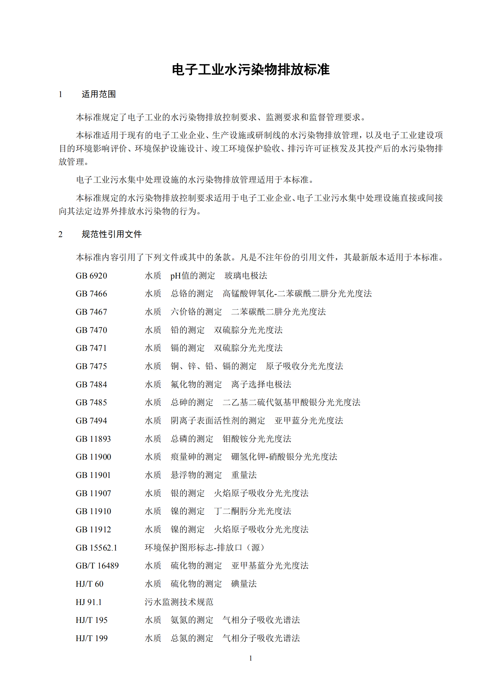 本標(biāo)準(zhǔn)規(guī)定了電子工業(yè)企業(yè)、生產(chǎn)設(shè)施或研制線的水污染物排放控制要求,監(jiān)測要求和監(jiān)督管理要求。電子工業(yè)污水集中處理設(shè)施的水污染物排放管理也適用于本標(biāo)準(zhǔn)。