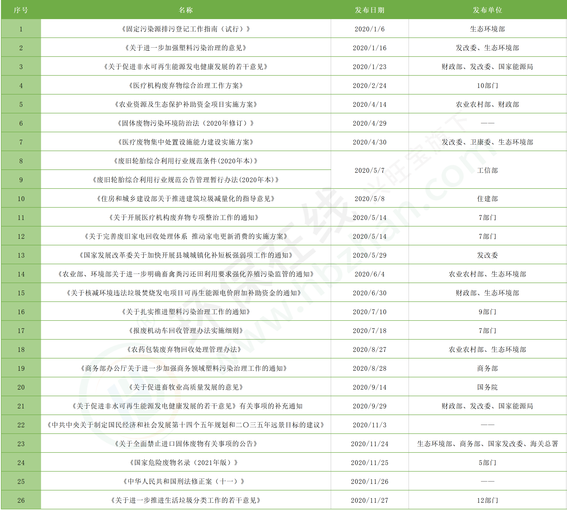 本文在2020年末尾展開(kāi)年終匯總,將本年度重要的固廢相關(guān)政策法規(guī)整理如下: