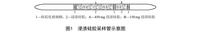 4.21 浸漬硅膠采樣管:長(zhǎng)15cm,外徑6mm,內(nèi)徑4mm的玻璃管,內(nèi)裝兩段浸漬硅膠,其中A段450mg,B段150mg,采樣管兩端和兩段浸漬硅膠之間用硅烷化玻璃棉填塞,裝填后兩端熔封。可購(gòu)買市售商品化采樣管。采樣管示意圖見圖1。