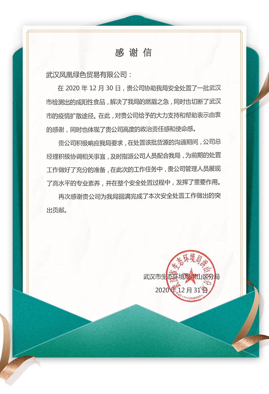 事后,武漢市生態(tài)環(huán)境局向武漢鳳凰項目發(fā)來感謝信,信中表示,在此次工作任務(wù)中,武漢鳳凰項目體現(xiàn)出了高度的政治責(zé)任感和使命感,展現(xiàn)出高水平的專業(yè)素養(yǎng),發(fā)揮了重要作用。