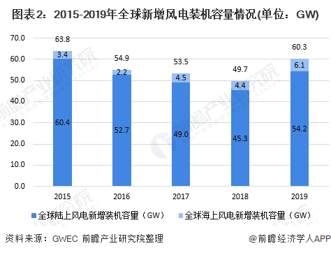 根據(jù)全球風(fēng)能理事會(huì)(GWEC)發(fā)布的《全球風(fēng)能報(bào)告2019》公布的數(shù)據(jù)顯示,2019年全球風(fēng)電新增裝機(jī)容量為60.4GW,同比增長19%,其中陸上新增風(fēng)電裝機(jī)容量54.3GW,海上新增風(fēng)電裝機(jī)容量6.1GW。