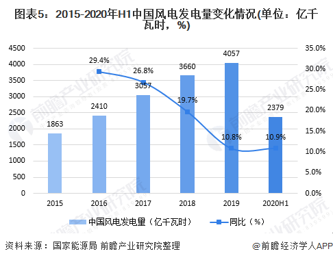 近年來,我國裝機(jī)容量的大幅度攀升帶動(dòng)了發(fā)電量的高速增長。2019年,中國風(fēng)電發(fā)電大幅增長到4057億千瓦時(shí),同比增長10.85%;2020年上半年,全國風(fēng)電發(fā)電量為2379億千瓦時(shí),同比增長10.9%。
