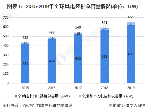 近年來,風(fēng)力發(fā)電作為清潔能源備受全球各國關(guān)注,全球風(fēng)力發(fā)電規(guī)模穩(wěn)步增長,根據(jù)全球風(fēng)能理事會(huì)(GWEC)發(fā)布的《全球風(fēng)能報(bào)告2019》公布的數(shù)據(jù)顯示,2019年全球風(fēng)電裝機(jī)總?cè)萘繛?51GW,同比增長12%,其中陸上風(fēng)電裝機(jī)容量621GW,海上風(fēng)電裝機(jī)容量30GW??傮w來說,目前全球風(fēng)力發(fā)電以陸上風(fēng)力發(fā)電為主。