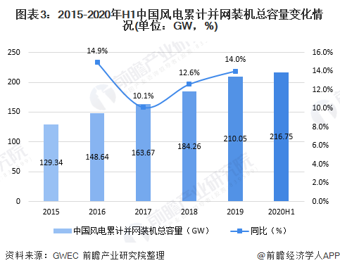 我國風(fēng)電產(chǎn)業(yè)在近幾年得到快速發(fā)展,風(fēng)電裝機(jī)容量快速增長,2019年,我國風(fēng)電裝機(jī)容量達(dá)到了210.05GW,同比增長14%,截至2020年上半年,我國我國風(fēng)電裝機(jī)容量達(dá)到了216.75GW。