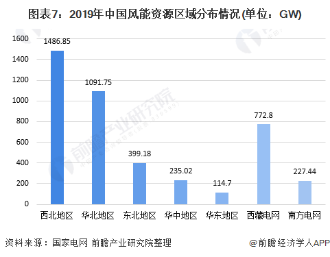 由于受地域和氣候的影響,我國風(fēng)能資源在地理分布上差異較大,風(fēng)能資源較多分布在西北、華北和東北地區(qū),2019年我國西北地區(qū)風(fēng)電總儲(chǔ)量達(dá)1486.85GW,是風(fēng)電資源儲(chǔ)量最大的地區(qū)。