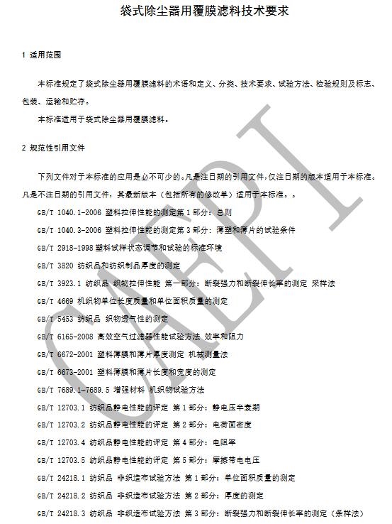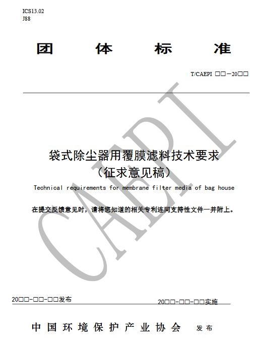 關(guān)于征求中國環(huán)境保護(hù)產(chǎn)業(yè)協(xié)會標(biāo)準(zhǔn)《袋式除塵器用覆膜濾料》意見的函