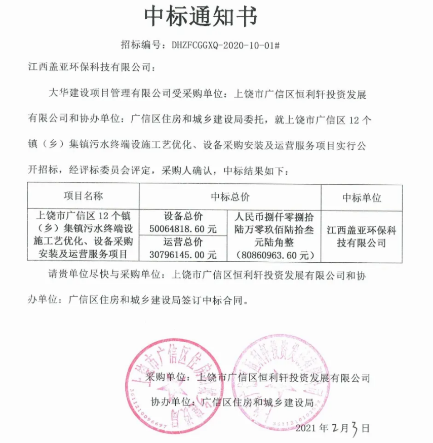 2021年1月28日,蓋亞中南成功中標(biāo)上饒市廣信區(qū)12個(gè)鎮(zhèn)(鄉(xiāng))集鎮(zhèn)污水終端設(shè)施工藝優(yōu)化、設(shè)備采購(gòu)安裝及運(yùn)營(yíng)服務(wù)項(xiàng)目。中標(biāo)金額達(dá)捌仟零捌拾陸萬(wàn)零玖佰陸拾叁元陸角整(¥80860963.60元)。