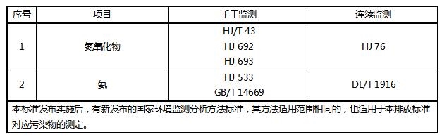 監(jiān)測分析方法:氮氧化物的監(jiān)測要求應按照HJ/T 397和HJ 75的規(guī)定執(zhí)行,氨逃逸的監(jiān)測要求按照HJ 2040的規(guī)定執(zhí)行。監(jiān)測分析方法見表2。