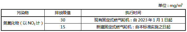 現(xiàn)有固定式燃氣輪機自2023年1月1日起執(zhí)行表1規(guī)定的氮氧化物排放限值。新建固定式燃氣輪機自本標準實施之日起執(zhí)行表1規(guī)定的氮氧化物排放限值。新建固定式燃氣輪機煙囪高度及距離周邊住宅的距離按批復的環(huán)境影響報告書(表)確定。