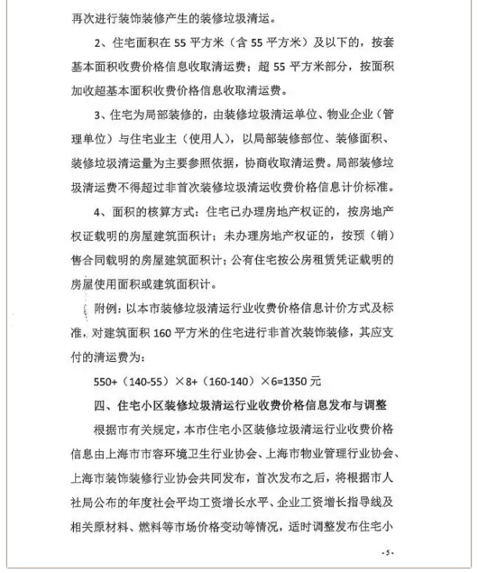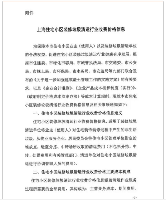 8月17日,《上海住宅小區(qū)裝修垃圾清運(yùn)行業(yè)收費(fèi)價(jià)格信息》(下稱(chēng)《價(jià)格信息》)公布,《價(jià)格信息》明確了住宅小區(qū)裝修垃圾清運(yùn)行業(yè)收費(fèi)價(jià)格信息的定義,明確收費(fèi)價(jià)格主要成本構(gòu)成、計(jì)價(jià)方式、標(biāo)準(zhǔn)以及收費(fèi)主體。住宅小區(qū)裝修垃圾清運(yùn),根據(jù)首次和非首次裝飾裝修、基本面積等標(biāo)準(zhǔn)計(jì)價(jià),此外,機(jī)關(guān)、企事業(yè)單位裝飾裝修垃圾清運(yùn)處置費(fèi)將根據(jù)清運(yùn)、分揀等環(huán)節(jié),按市場(chǎng)化、全成本要素,協(xié)商收取。