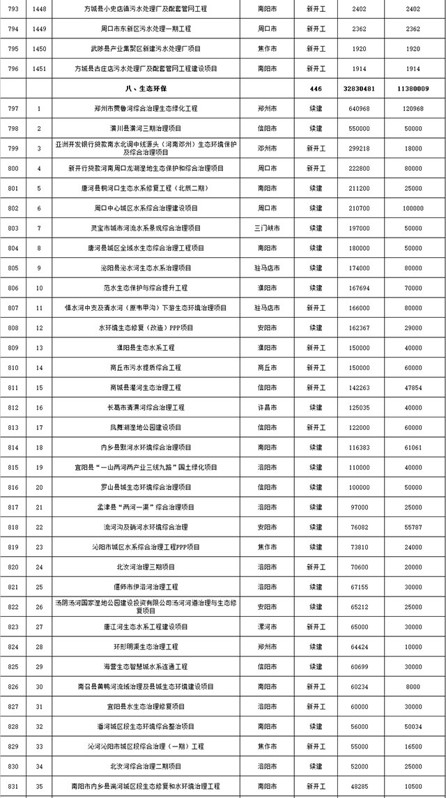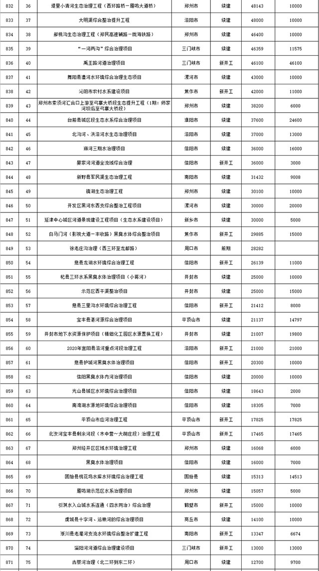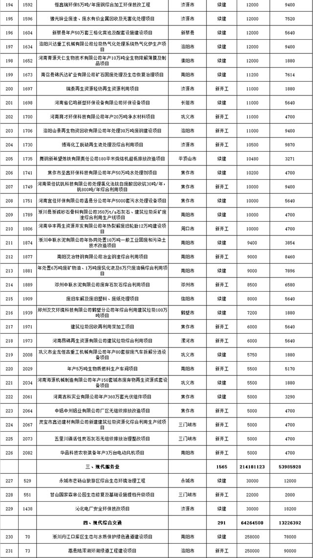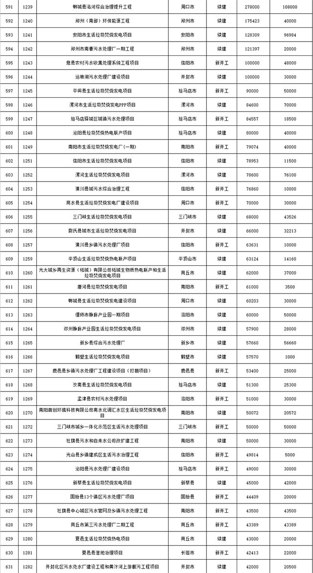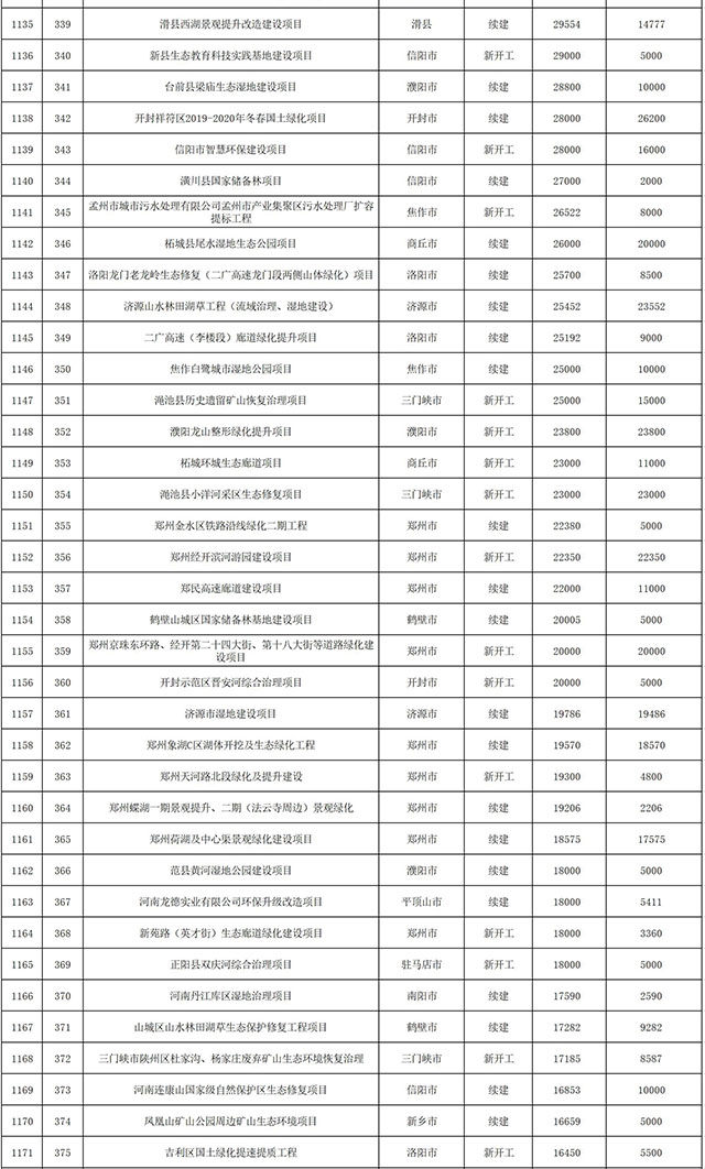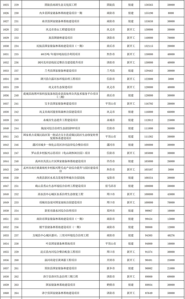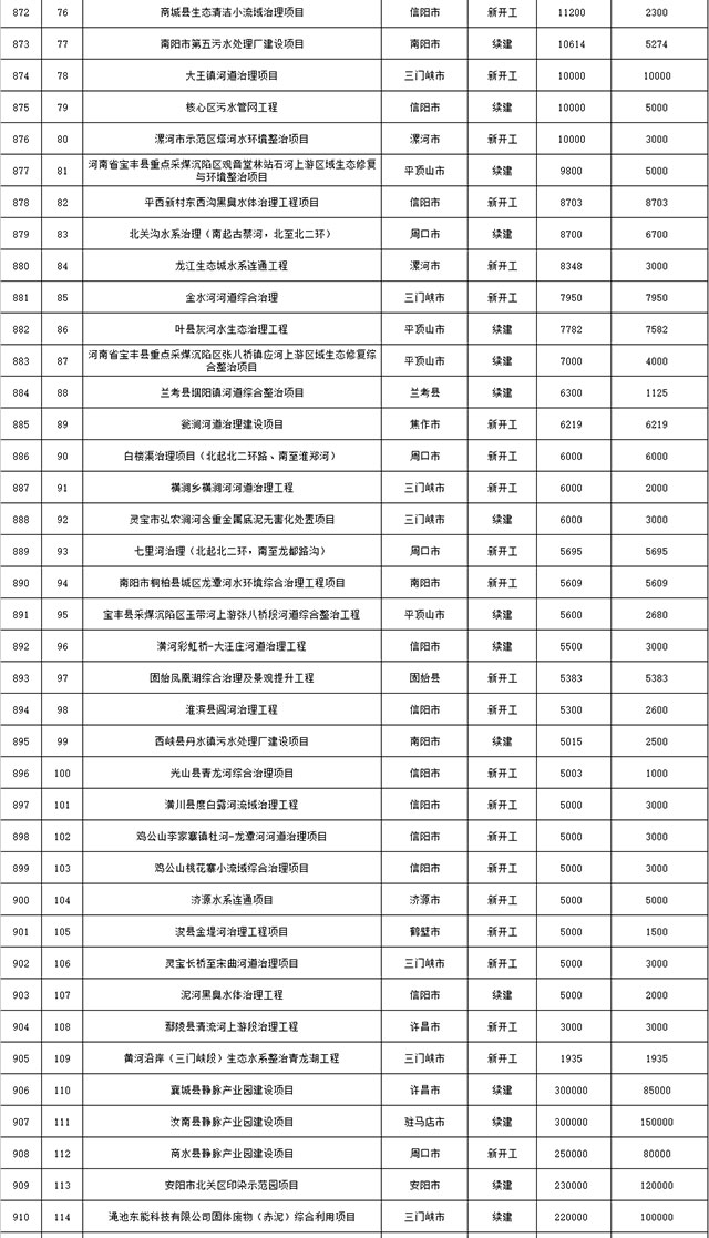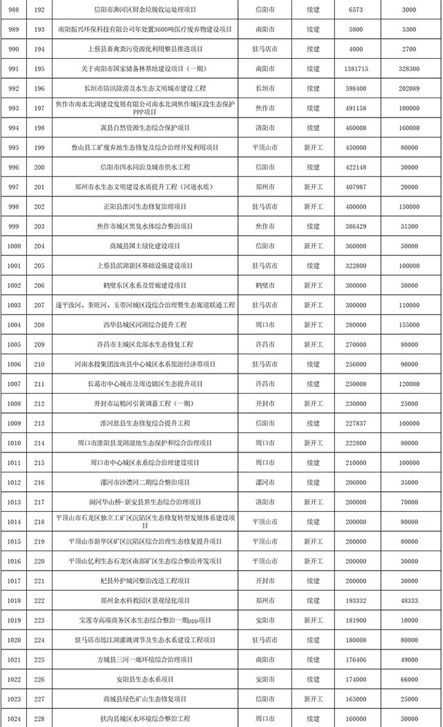 包括鄭州市賈魯河綜合治理生態(tài)綠化工程、潢川縣潢河三期治理項(xiàng)目、唐河縣桐河口生態(tài)水系修復(fù)工程(北辰二期)、周口中心城區(qū)水系綜合治理建設(shè)項(xiàng)目、泌陽縣泌水河生態(tài)水系治理項(xiàng)目、潘河城區(qū)段生態(tài)環(huán)境綜合整治項(xiàng)目、確山縣宏聲建筑垃圾資源化再利用項(xiàng)目、寶豐縣廢棄礦山地質(zhì)生態(tài)環(huán)境修復(fù)與綜合治理項(xiàng)目、西華縣靜脈產(chǎn)業(yè)園建設(shè)項(xiàng)目、三門峽危險廢物綜合處置中心建設(shè)項(xiàng)目、平輿縣建筑垃圾回收再利用建設(shè)項(xiàng)目、孟州市污泥和工業(yè)園固體廢物處理項(xiàng)目、許昌餐廚垃圾回收處理項(xiàng)目、平頂山市報廢汽車回收拆解項(xiàng)目、上蔡縣畜禽糞污資源化利用整縣推進(jìn)項(xiàng)目、焦作市城區(qū)黑臭水體綜合整治項(xiàng)目、信陽市智慧環(huán)保建設(shè)項(xiàng)目、山城區(qū)山水林田湖草生態(tài)保護(hù)修復(fù)工程項(xiàng)目、鳳凰山礦山公園周邊礦山生態(tài)環(huán)境項(xiàng)目、山水林田湖草及沿黃生態(tài)環(huán)境綜合治理項(xiàng)目、澠池縣油煙監(jiān)控建設(shè)項(xiàng)目、羅山縣礦山地質(zhì)環(huán)境恢復(fù)與綜合治理項(xiàng)目等。