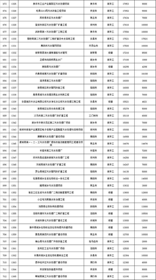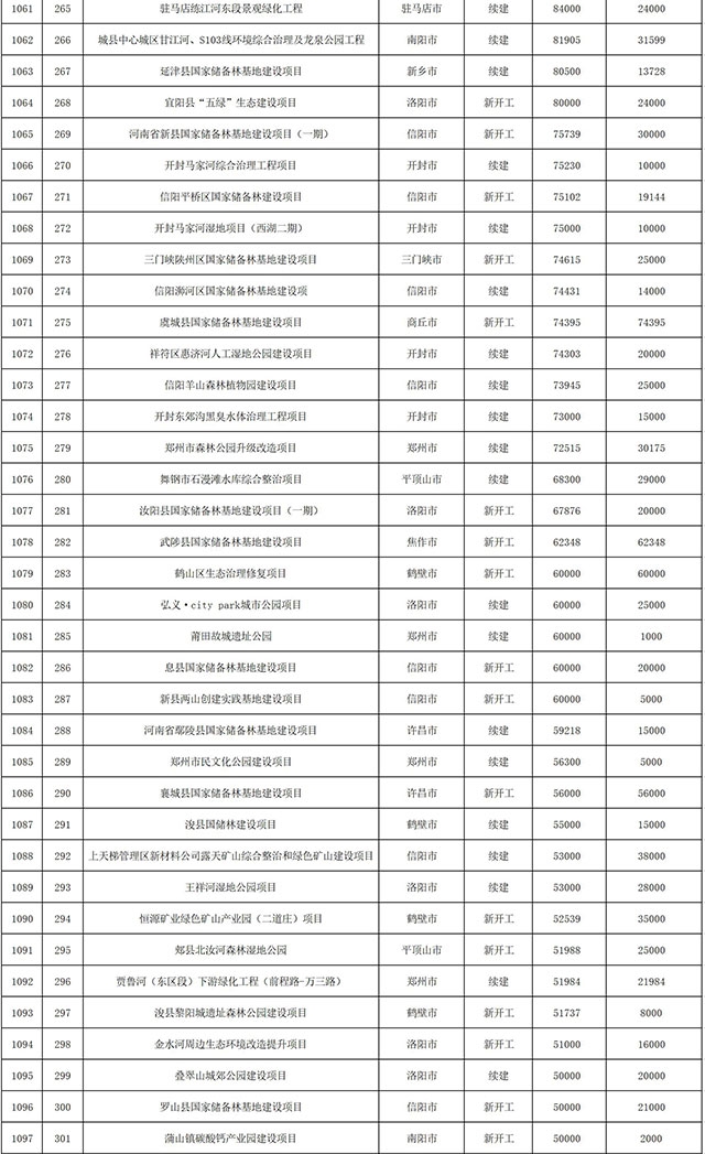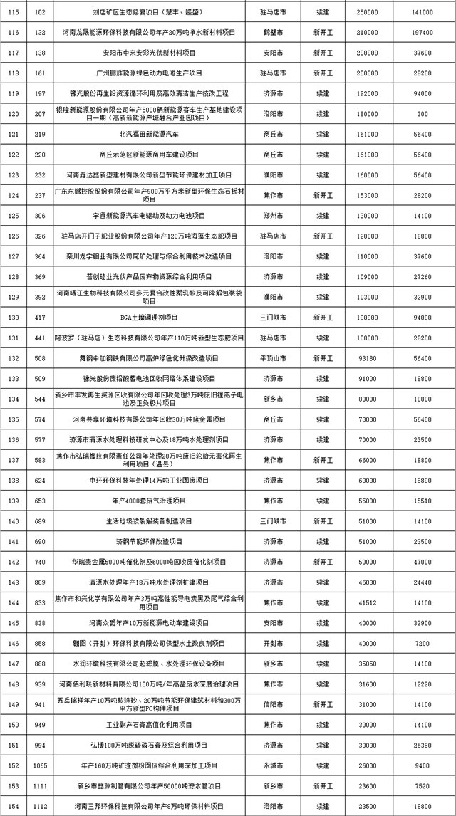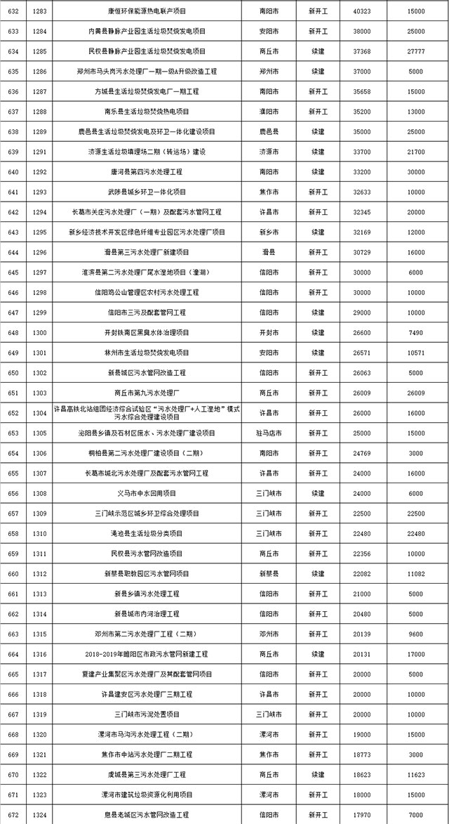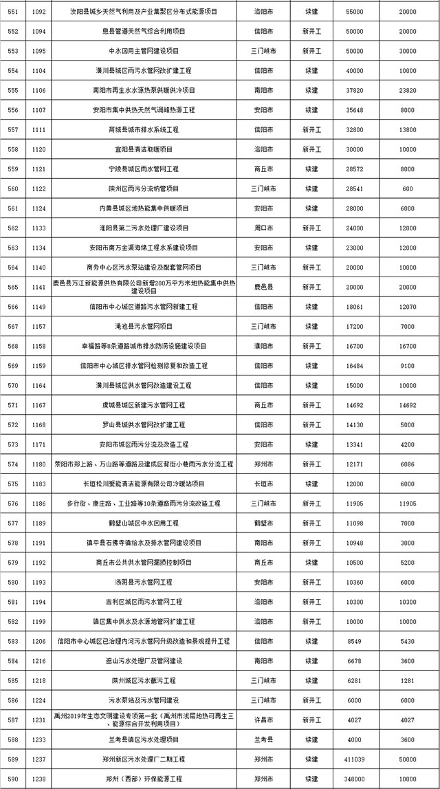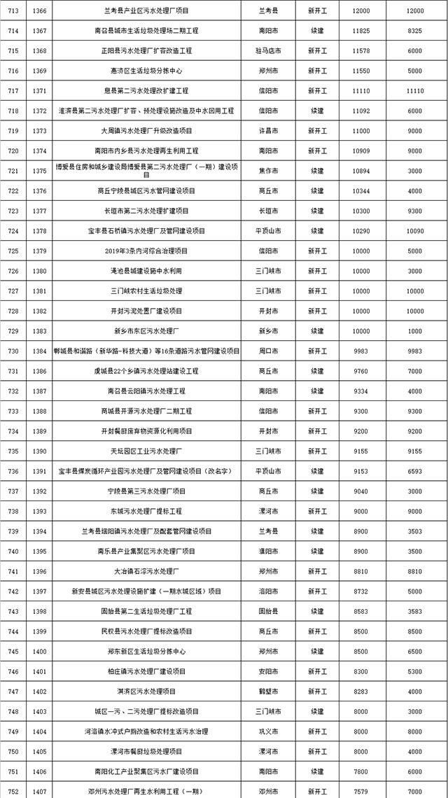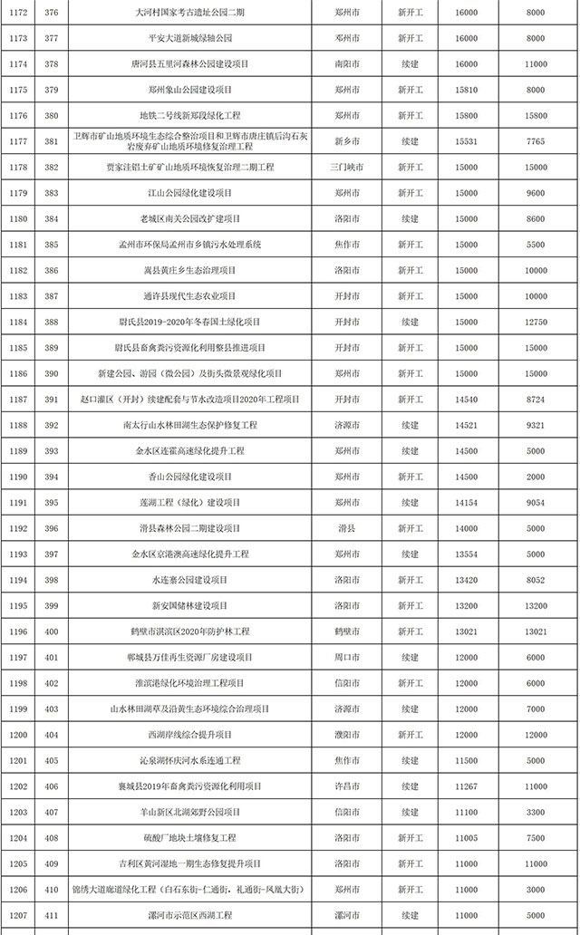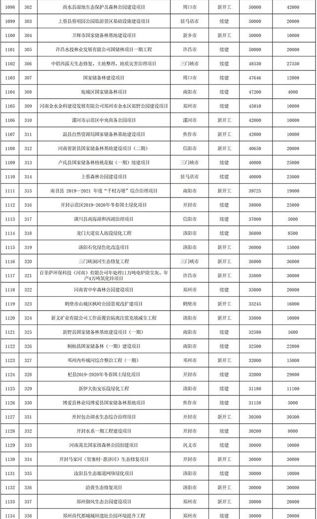 包括鄭州市賈魯河綜合治理生態(tài)綠化工程、潢川縣潢河三期治理項(xiàng)目、唐河縣桐河口生態(tài)水系修復(fù)工程(北辰二期)、周口中心城區(qū)水系綜合治理建設(shè)項(xiàng)目、泌陽縣泌水河生態(tài)水系治理項(xiàng)目、潘河城區(qū)段生態(tài)環(huán)境綜合整治項(xiàng)目、確山縣宏聲建筑垃圾資源化再利用項(xiàng)目、寶豐縣廢棄礦山地質(zhì)生態(tài)環(huán)境修復(fù)與綜合治理項(xiàng)目、西華縣靜脈產(chǎn)業(yè)園建設(shè)項(xiàng)目、三門峽危險廢物綜合處置中心建設(shè)項(xiàng)目、平輿縣建筑垃圾回收再利用建設(shè)項(xiàng)目、孟州市污泥和工業(yè)園固體廢物處理項(xiàng)目、許昌餐廚垃圾回收處理項(xiàng)目、平頂山市報廢汽車回收拆解項(xiàng)目、上蔡縣畜禽糞污資源化利用整縣推進(jìn)項(xiàng)目、焦作市城區(qū)黑臭水體綜合整治項(xiàng)目、信陽市智慧環(huán)保建設(shè)項(xiàng)目、山城區(qū)山水林田湖草生態(tài)保護(hù)修復(fù)工程項(xiàng)目、鳳凰山礦山公園周邊礦山生態(tài)環(huán)境項(xiàng)目、山水林田湖草及沿黃生態(tài)環(huán)境綜合治理項(xiàng)目、澠池縣油煙監(jiān)控建設(shè)項(xiàng)目、羅山縣礦山地質(zhì)環(huán)境恢復(fù)與綜合治理項(xiàng)目等。