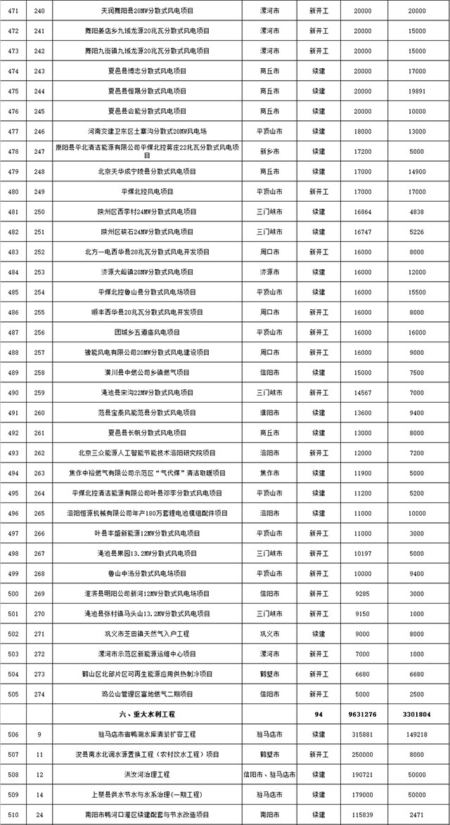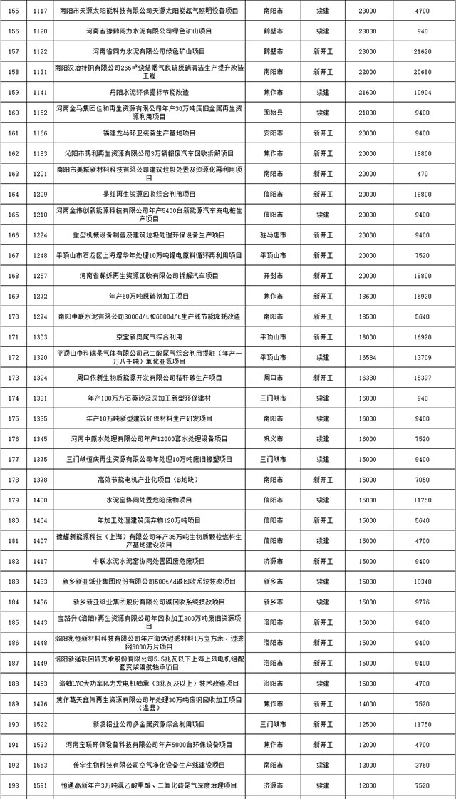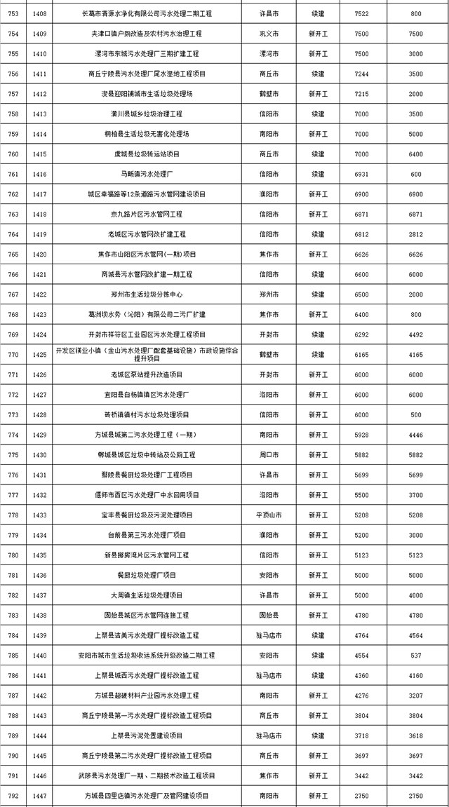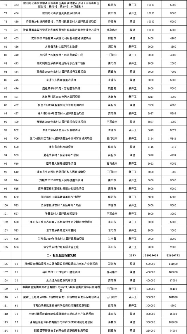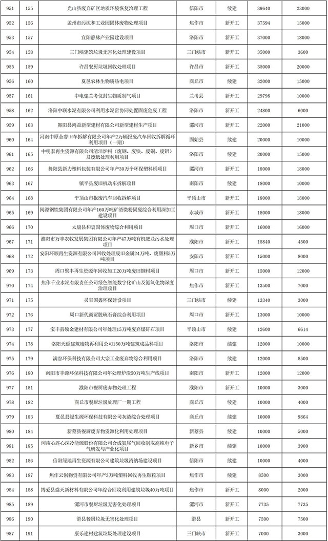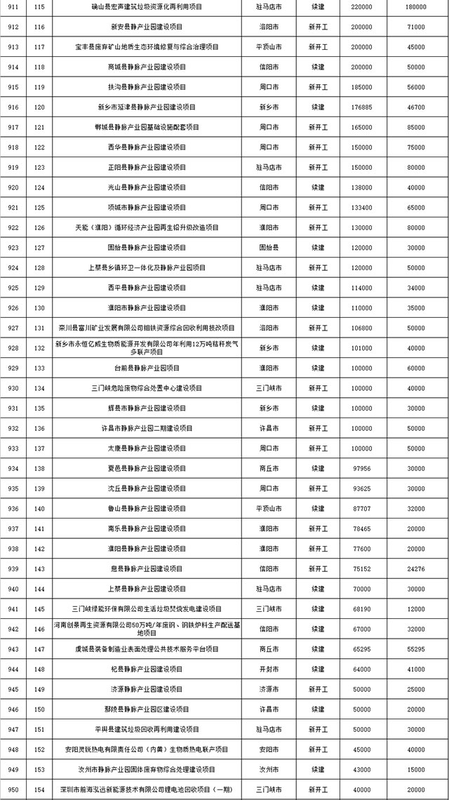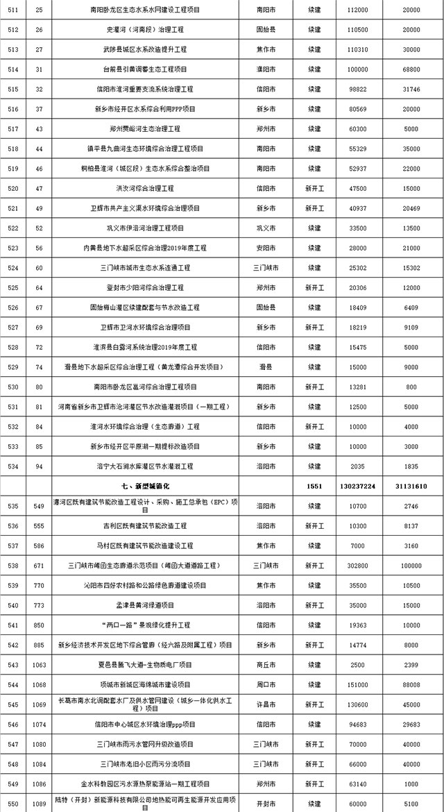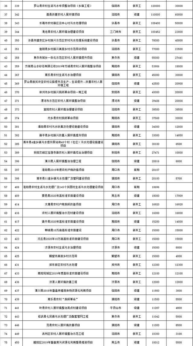 包括鄭州市賈魯河綜合治理生態(tài)綠化工程、潢川縣潢河三期治理項(xiàng)目、唐河縣桐河口生態(tài)水系修復(fù)工程(北辰二期)、周口中心城區(qū)水系綜合治理建設(shè)項(xiàng)目、泌陽縣泌水河生態(tài)水系治理項(xiàng)目、潘河城區(qū)段生態(tài)環(huán)境綜合整治項(xiàng)目、確山縣宏聲建筑垃圾資源化再利用項(xiàng)目、寶豐縣廢棄礦山地質(zhì)生態(tài)環(huán)境修復(fù)與綜合治理項(xiàng)目、西華縣靜脈產(chǎn)業(yè)園建設(shè)項(xiàng)目、三門峽危險廢物綜合處置中心建設(shè)項(xiàng)目、平輿縣建筑垃圾回收再利用建設(shè)項(xiàng)目、孟州市污泥和工業(yè)園固體廢物處理項(xiàng)目、許昌餐廚垃圾回收處理項(xiàng)目、平頂山市報廢汽車回收拆解項(xiàng)目、上蔡縣畜禽糞污資源化利用整縣推進(jìn)項(xiàng)目、焦作市城區(qū)黑臭水體綜合整治項(xiàng)目、信陽市智慧環(huán)保建設(shè)項(xiàng)目、山城區(qū)山水林田湖草生態(tài)保護(hù)修復(fù)工程項(xiàng)目、鳳凰山礦山公園周邊礦山生態(tài)環(huán)境項(xiàng)目、山水林田湖草及沿黃生態(tài)環(huán)境綜合治理項(xiàng)目、澠池縣油煙監(jiān)控建設(shè)項(xiàng)目、羅山縣礦山地質(zhì)環(huán)境恢復(fù)與綜合治理項(xiàng)目等。