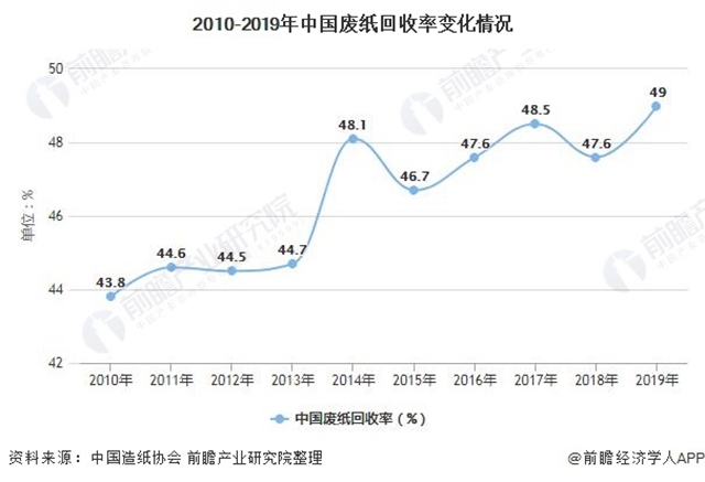 但近年來,隨著國民環(huán)保意識的調(diào)高和垃圾分類的推廣,我國廢紙回收率波動上升,2019年,我國廢紙回收率達(dá)到49.0%,實現(xiàn)10年間廢紙回收率的新高。