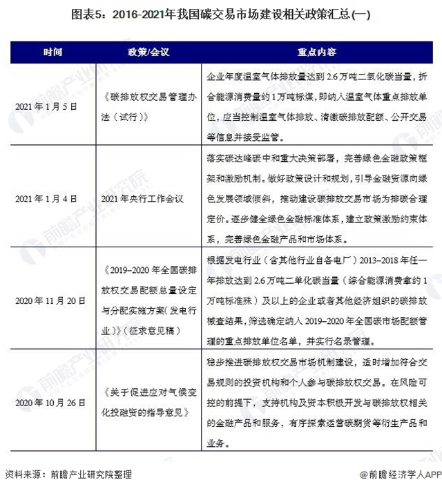 碳排放權(quán)交易體系是實(shí)現(xiàn)低成本碳減排的關(guān)鍵。2016-2021年是我國碳交易市場的黃金時(shí)期,我國出臺了一系列政策建立包括建立相關(guān)綠色金融、碳中和等來推動碳交易市場發(fā)展,具體政策匯總?cè)缦拢?/div>
