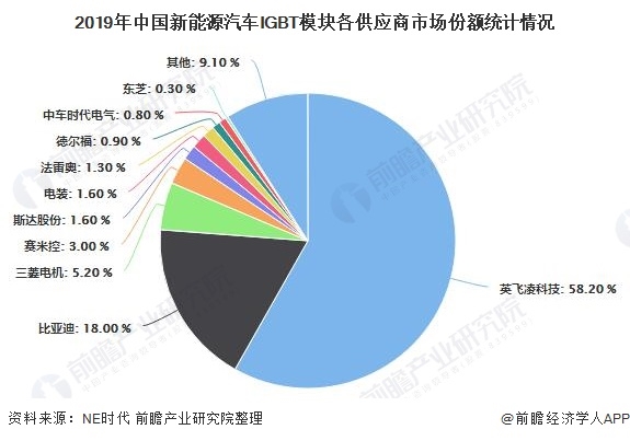 在國內(nèi)新能源汽車IGBT模塊市場中,英飛凌公司中是絕對的龍頭老大,市場占比58.2%,相比2016年33%的市場占比,其市場地位有了進一步的鞏固。比亞迪微電子則在多年的技術(shù)積累中,逐漸成長為中國IGBT市場份額第二大企業(yè)。中車時代電氣則以軌交IGBT為市場切入點,不斷拓展業(yè)務(wù)至電動汽車及智能電網(wǎng)市場,2019年市場份額逐漸攀升至0.8%。