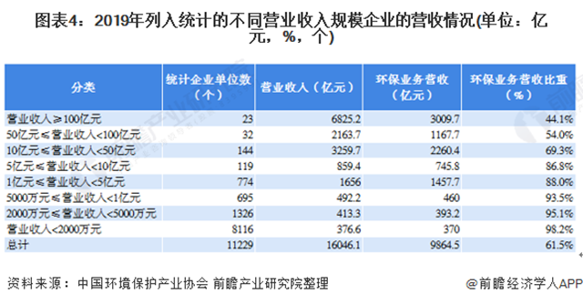 營業(yè)收入規(guī)模越小的企業(yè),環(huán)保業(yè)務(wù)營業(yè)收入在總營業(yè)收入中所占比重越高,其環(huán)保專業(yè)化程度也越高,營業(yè)收入超過l00億元的企業(yè),環(huán)保業(yè)務(wù)營業(yè)收入平均占比為44.l%,營業(yè)收入小于2000萬元的企業(yè),其環(huán)保業(yè)務(wù)營業(yè)收入平均占比達98.2%。