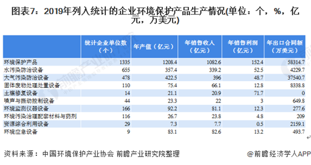 在《2020環(huán)保產(chǎn)業(yè)發(fā)展?fàn)顩r報告》中,2019年納入統(tǒng)計的環(huán)保設(shè)備市場共有1583家企業(yè);年產(chǎn)值為1018.60億元,銷售收入和銷售利潤分別為949.10億元和135.80億元,實現(xiàn)出口合同額51245.60萬美元。
