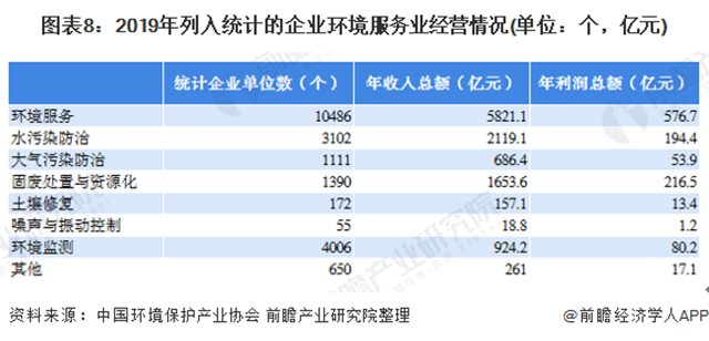 據(jù)環(huán)境保護產(chǎn)業(yè)協(xié)會數(shù)據(jù),涉及企業(yè)樣本包括參加全國環(huán)保產(chǎn)業(yè)重點企業(yè)基本情況調(diào)查的3535家企業(yè)、參加全國環(huán)境服務(wù)業(yè)財務(wù)統(tǒng)計的8943家企業(yè),剔除重復(fù)樣本,共計11003家企業(yè)。上述企業(yè)2019年營業(yè)收入總額7597.5億元、營業(yè)利潤總額689.9億元,其中,環(huán)保業(yè)務(wù)營業(yè)收入6385.7億元。