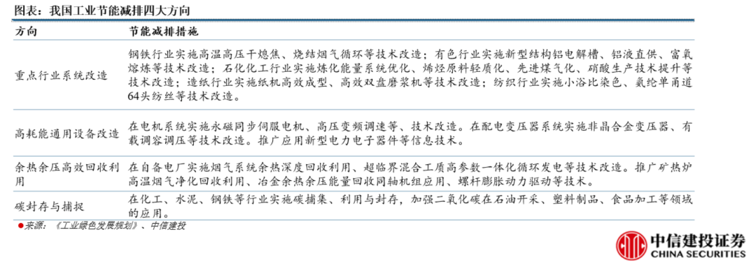在碳達峰的背景下,我國工業(yè)將加快節(jié)能減排改造。從具體措施來看,我國工業(yè)節(jié)能減排主要通過傳統(tǒng)工業(yè)領(lǐng)域系統(tǒng)改造、高耗能通用設(shè)備改造、余熱余壓高效回收利用、碳封存與捕捉等措施來實現(xiàn)節(jié)能減排。