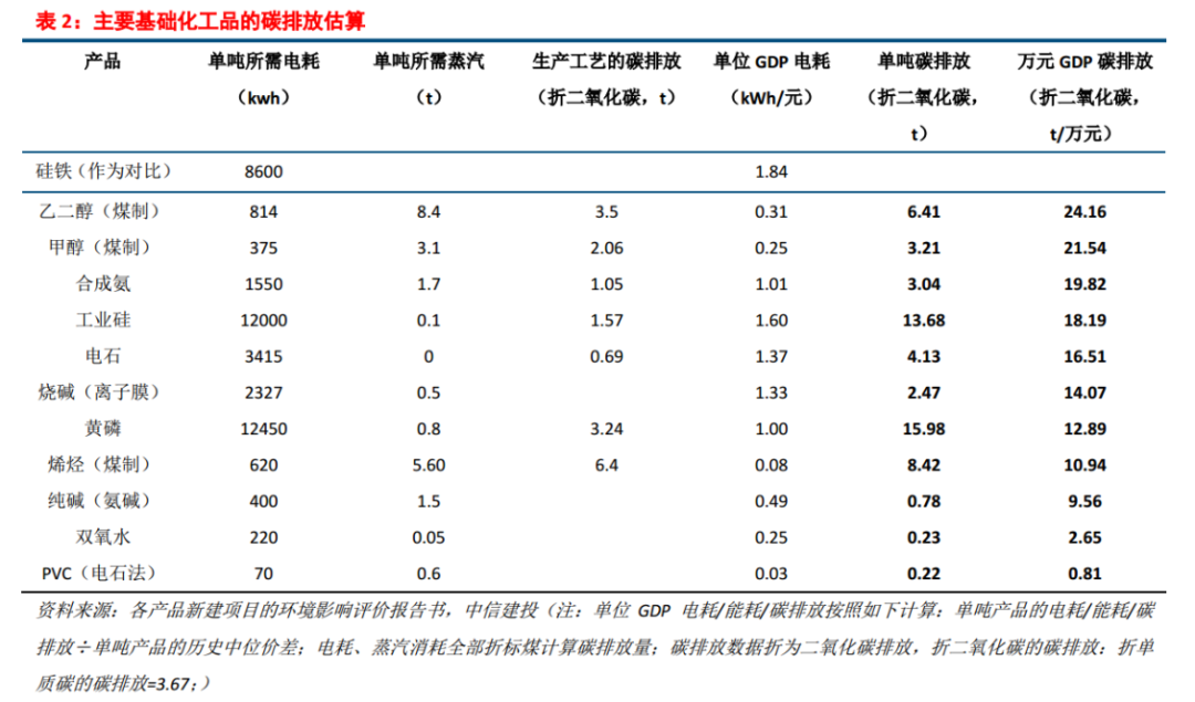 根據(jù)計算結(jié)果,單位GDP碳排放居于前列的基礎(chǔ)化工產(chǎn)品分別是煤制乙二醇、煤制甲醇、合成氨、工業(yè)硅、電石、燒堿、黃磷、MTO、純堿。集中在低附加值的大宗化工品,基本上與電耗高/電力成本占比高的產(chǎn)品相吻合。同時,也與內(nèi)蒙古給出的禁止新建產(chǎn)能的化工品清單基本吻合。