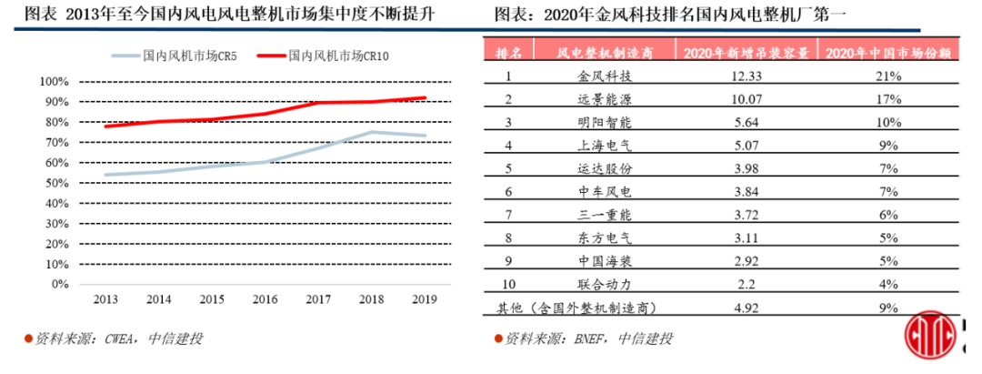 國內(nèi)風電整機市場(含原材料及零部件)規(guī)模超千億,行業(yè)集中度高。從風電場資本開支構(gòu)成來看,國內(nèi)風電整機市場(含原材料及零部件)規(guī)模超千億元。風電場資本開支由風電整機、系統(tǒng)平衡(電氣基礎(chǔ)設(shè)施、組裝和安裝)以及財務(wù)費用(保險、建筑融資等)組成,其中陸地風電場資本開支中風電整機投入占比約65-70%,以此推算,國內(nèi)風電整機市場(含原材料及零部件)規(guī)模超千億元。重點推薦風電整機龍頭金風科技。