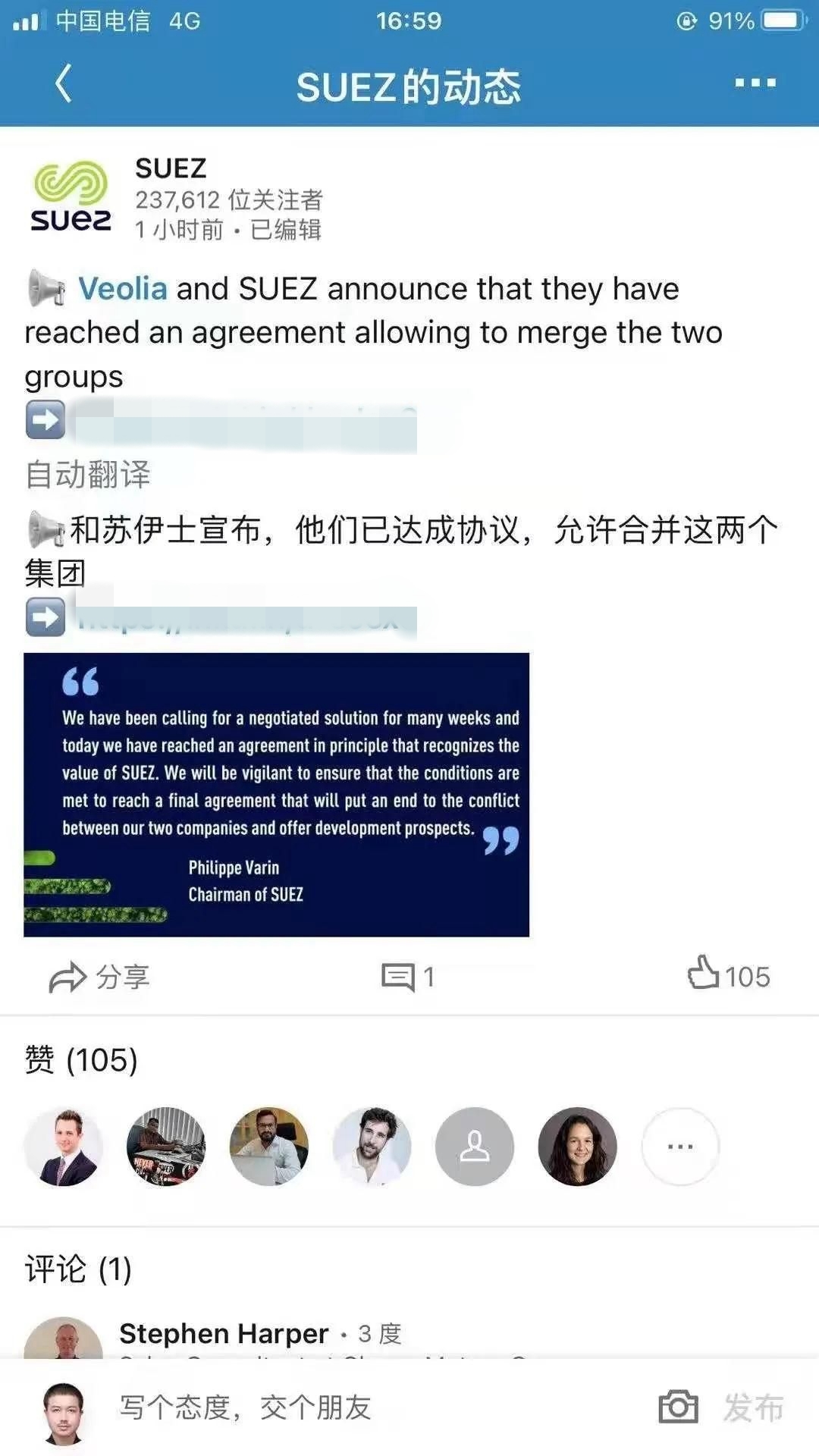 該協(xié)議將從工業(yè)和社會(huì)的角度出發(fā),創(chuàng)建新的蘇伊士公司,該公司的資產(chǎn)由一個(gè)連貫的,可持續(xù)的部門(mén)組成,并具有真正的增長(zhǎng)潛力,營(yíng)業(yè)額約為70億歐元;通過(guò)蘇伊士收購(gòu)要約,威立雅創(chuàng)造了生態(tài)轉(zhuǎn)型世界冠軍的計(jì)劃的實(shí)施,該交易的銷(xiāo)售額約為370億歐元,其中仍將保留威立雅確定的所有戰(zhàn)略資產(chǎn)等。
