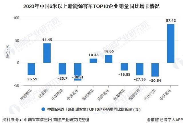 從銷量前10企業(yè)的銷售增長(zhǎng)情況來看,2020年1-12月份,在新能源客車行業(yè)市場(chǎng)整體銷量大幅縮減背景下,僅有比亞迪、海格客車、安凱客車和申沃客車四家企業(yè)實(shí)現(xiàn)正增長(zhǎng),其中比亞迪增長(zhǎng)率達(dá)到44.45%,逆勢(shì)增長(zhǎng)的勢(shì)頭迅猛。