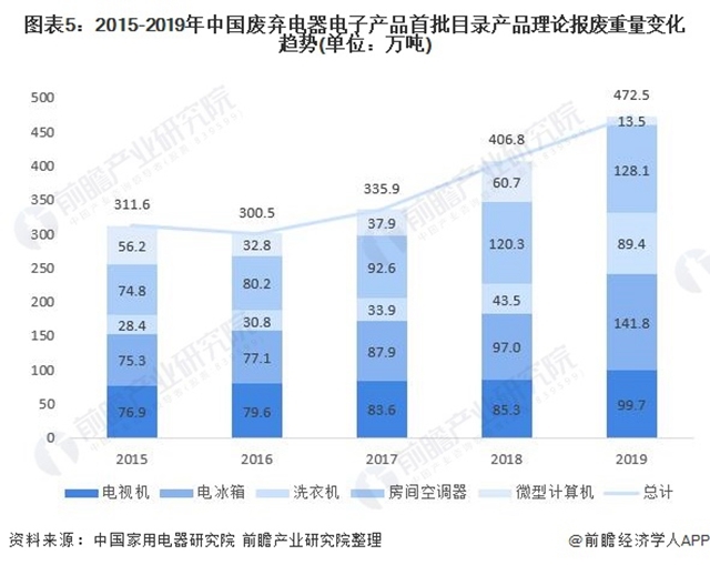 從理論報(bào)廢重量上看,2015-2019年,我國(guó)廢棄電器電子產(chǎn)品首批目錄產(chǎn)品理論報(bào)廢重量整體呈上升趨勢(shì),2019年達(dá)472.5萬臺(tái)。具體來看,我國(guó)電視機(jī)、電冰箱、洗衣機(jī)、房間空調(diào)器理論報(bào)廢重量均呈上升趨勢(shì),微型計(jì)算機(jī)理論報(bào)廢重量波動(dòng)較大。