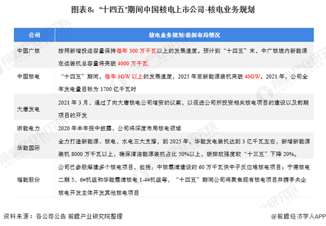 根據(jù)“十四五規(guī)劃和2035年愿景目標(biāo)綱要”,“十四五”期間,我國核電運行裝機容量達(dá)到7000萬千瓦。據(jù)此,核電行業(yè)的中國廣核、中國核電也相應(yīng)提出了其十四五發(fā)展目標(biāo),中國廣核表示將保持每年300萬千瓦以上發(fā)展速度,中國核電表示每年將保持3GW以上的發(fā)展速度。此外,核電企業(yè)的其他上市公司也明確了其核電業(yè)務(wù)的發(fā)展布局: