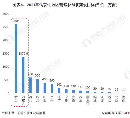 現(xiàn)階段,生態(tài)文明建設(shè)提升到新的戰(zhàn)略高度,造林綠化事業(yè)作為建設(shè)森林生態(tài)系統(tǒng)的主體,造林綠化成改善生態(tài)環(huán)境建設(shè)的重點(diǎn)關(guān)注領(lǐng)域,故此,代表性地區(qū)專門針對(duì)營造林綠化建設(shè)提出切實(shí)可行的發(fā)展目標(biāo)。其中甘肅、內(nèi)蒙古地區(qū)營造林綠化建設(shè)目標(biāo)均超過1000萬畝。