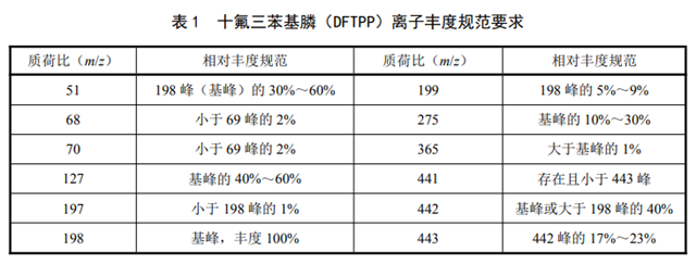 每次分析前,應(yīng)進(jìn)行質(zhì)譜自動(dòng)調(diào)諧,再將氣相色譜和質(zhì)譜儀設(shè)定至分析方法要求的儀器條件,并處于待機(jī)狀態(tài),通過氣相色譜進(jìn)樣直接注入 1.0 µl 十氟三苯基膦使用液(4.15),對(duì)整個(gè)系統(tǒng)進(jìn)行檢查,每運(yùn)行 12 h 檢查一次,得到十氟三苯基膦質(zhì)譜圖,其質(zhì)量碎片的離子的豐度應(yīng)全部符合表 1 中的要求。否則須清洗質(zhì)譜儀離子源。
