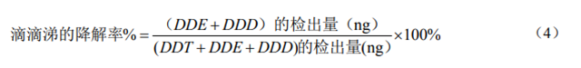 用色譜進(jìn)樣口檢查液(4.8)來檢查氣相色譜儀注射入口的惰性,滴滴涕(DDT)到滴滴伊(DDE)和滴滴滴(DDD)的降解率不應(yīng)超過 15%,滴滴涕的降解率按公式(4)進(jìn)行計(jì)算。如果 DDT 衰減過多或出現(xiàn)較差的色譜峰,則需要清洗或更換進(jìn)樣口,同時(shí)還應(yīng)截取毛細(xì)管柱前段約5 cm。聯(lián)苯胺和五氯苯酚等極性化合物在進(jìn)樣口易出現(xiàn)分解,峰形出現(xiàn)拖尾分裂等現(xiàn)象,也應(yīng)進(jìn)行同樣的處理。