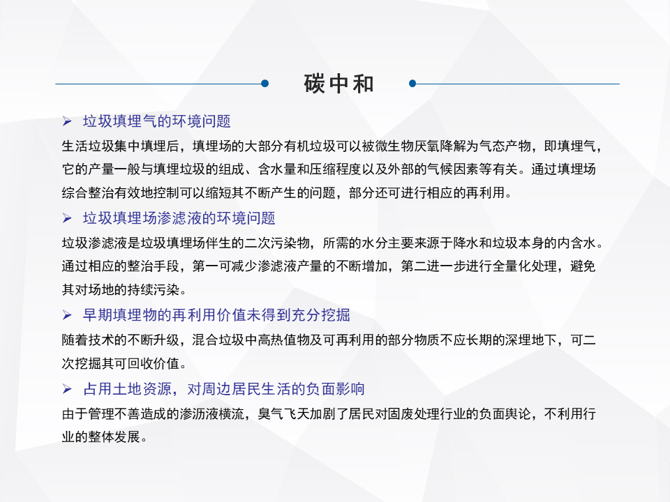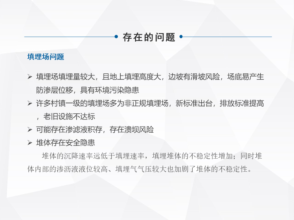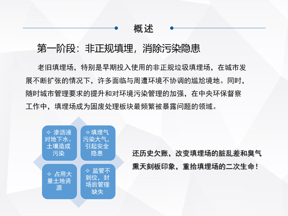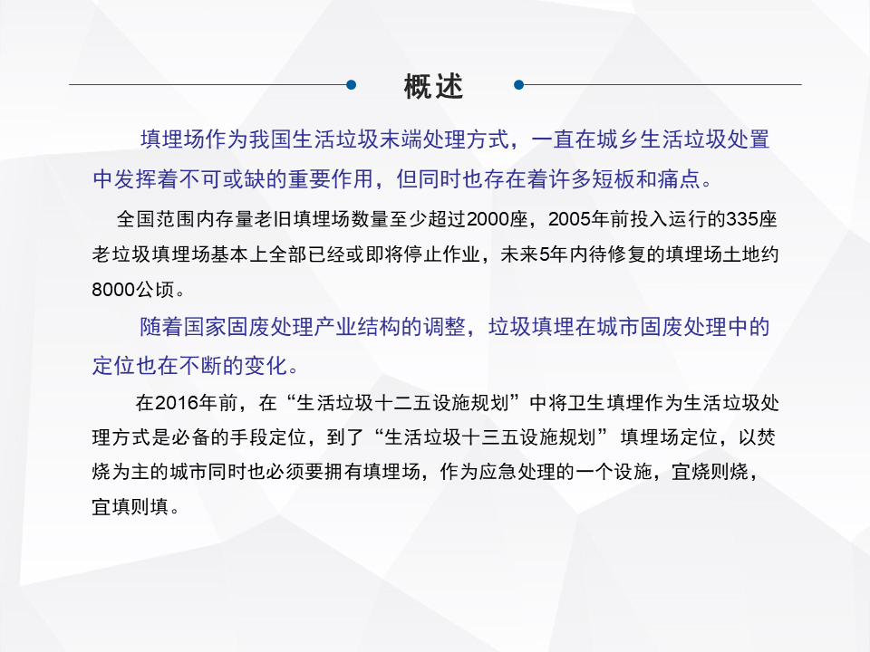 簡單快速地分享一下,老舊填埋場綜合整治,或者現(xiàn)在提出來叫存量垃圾處理,在咱們整個行業(yè)里面屬于一個角落。