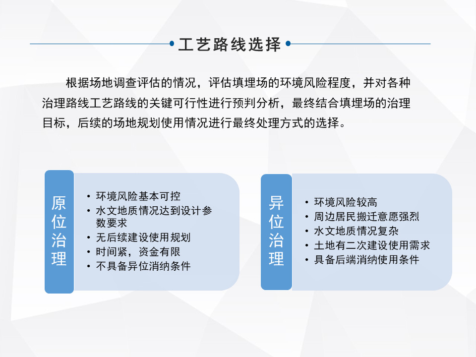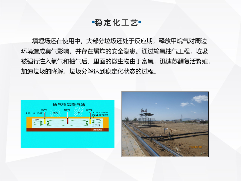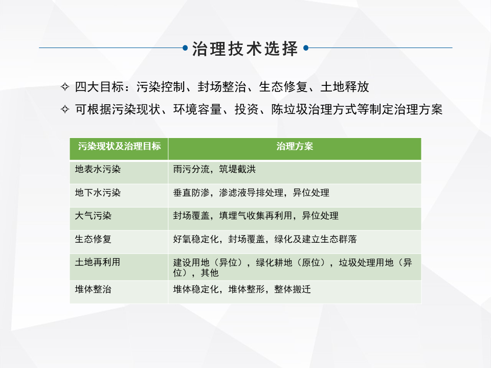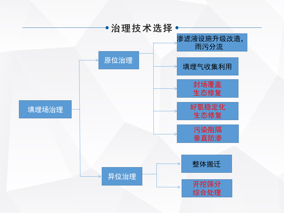 處理的技術涵蓋的面,整個行業(yè)涵蓋的面還是比較多的,大的來分,有原位的治理和異位的治理。原味的治理,像衛(wèi)生填埋場和簡易填埋場需要做一些現(xiàn)有的配套設施的升級,雨污分流,怎么樣能去有效的減少持續(xù)的像滲濾液產(chǎn)生。填埋氣的收集利用,還有有的是直接封廠覆蓋,做生態(tài)修復,還有做一個加速的酶化以后,再做生態(tài)修復。還有早期的簡易填埋,甚至沒有做防滲的,在現(xiàn)有不具備整體搬遷的條件下,去做一些污染阻隔。