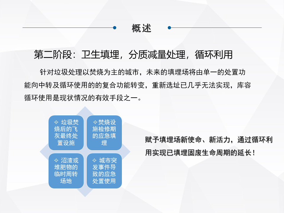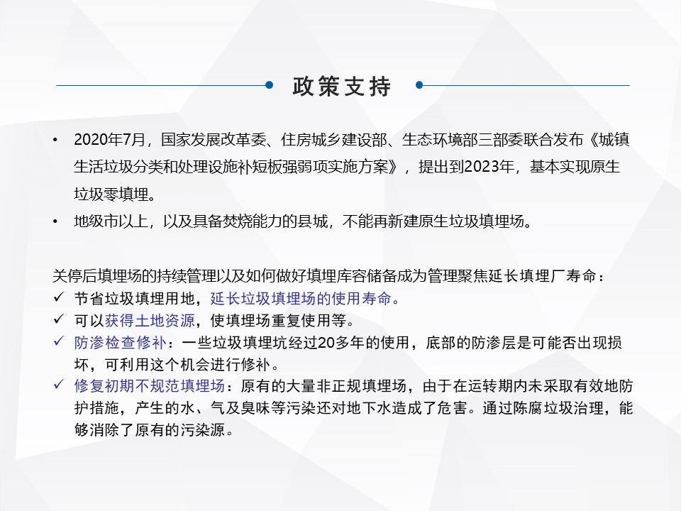 第二個階段,“十二五”、“十三五”主要針對非正規(guī)填埋場的治理,到“十四五”或者未來的十年,目前已經(jīng)開始關注新的填埋場由單一的處理功能向中轉和循環(huán)使用的復合功能區(qū)轉變,很多都是對填埋場的場地有再利用的需求,或者對庫容有循環(huán)利用的需求。近幾年,特別是北上廣深這些土地比較緊缺的,人口比較密集的城市,最早開始關注到這個行業(yè)。