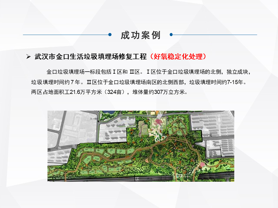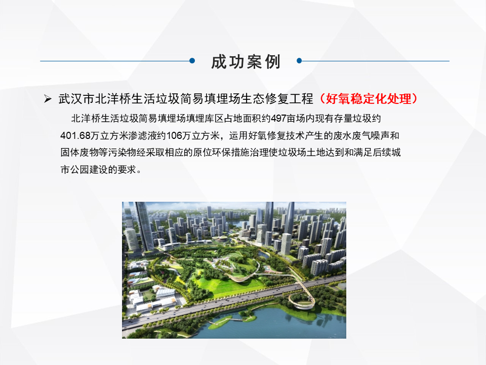 武漢的金口做了加速穩(wěn)定化,滲濾液的集中處理以后,當時是做成了武漢那一屆園博園的項目。這個是武漢北洋橋,是簡易填埋場的生態(tài)修復,這個項目最早12年我們?nèi)サ臅r候,它離武漢高鐵站特別近,周圍樓盤比較多,環(huán)境敏感度比較高。最早政府是要把它徹底清理的,最早想整體開挖和綜合處理,后來沒有采用,有幾個必要的條件,當時它的體量將近四百多萬方,治理的周圍不能特別長。短期之內(nèi)真的是開發(fā)出來,分選完了哪些物料,在短時間內(nèi)怎么有效的再利用和實現(xiàn)減量消納,是很難實施的。最后他先采用了原位修復的方式,先讓整體的環(huán)境得到了一個比較大程度的改善。