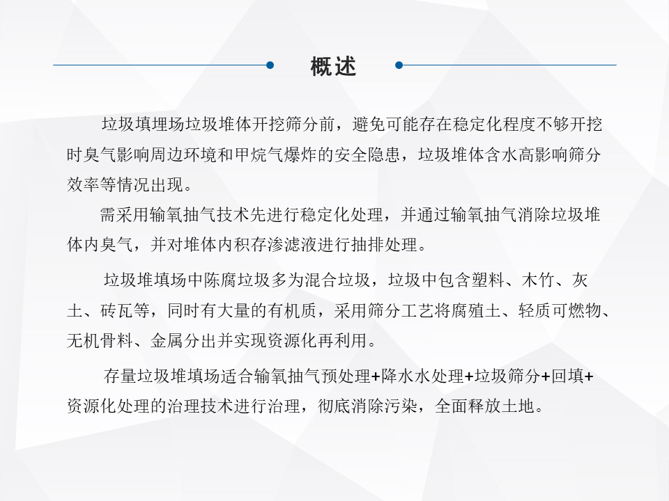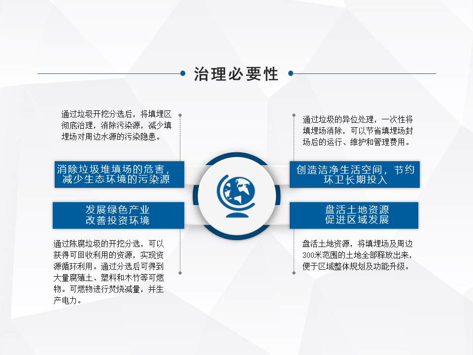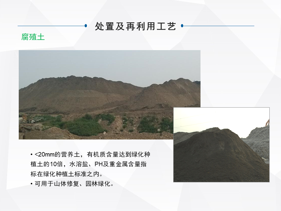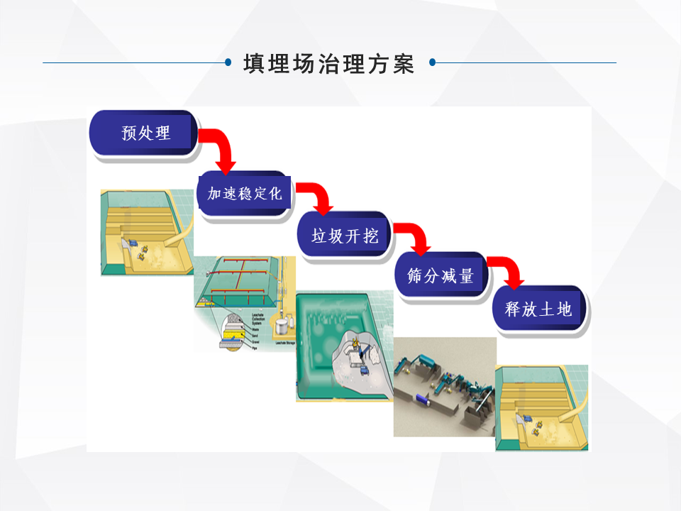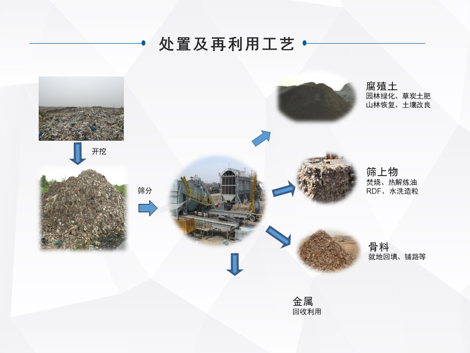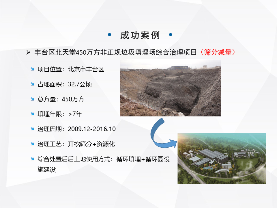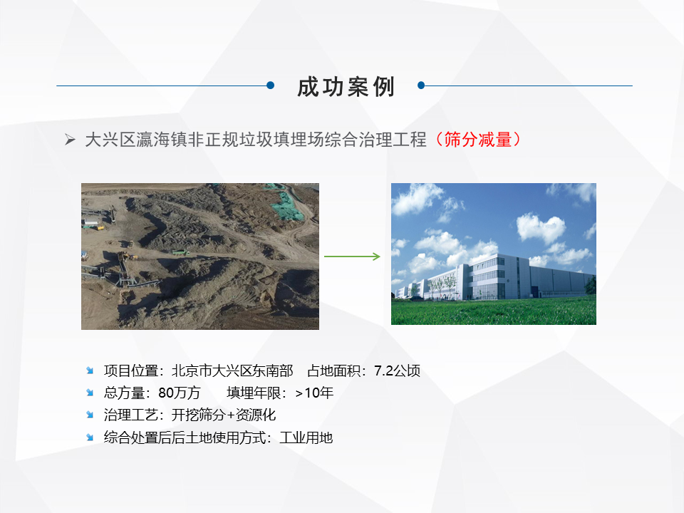 另外一種就是做一個異位的治理,這是一些小規(guī)模的,城市規(guī)劃了大型的填埋場,對一些小型的就做整體的搬遷。特別前幾年的時候,像河北很多地區(qū)整體的做坑塘垃圾的收集,就是把一些小散亂的,集中的匯到一個地方。還有一塊就是做綜合的處理,我們最早因為公司也是做分選技術出來的,最早我們主流是做綜合處理這塊比較多一些。