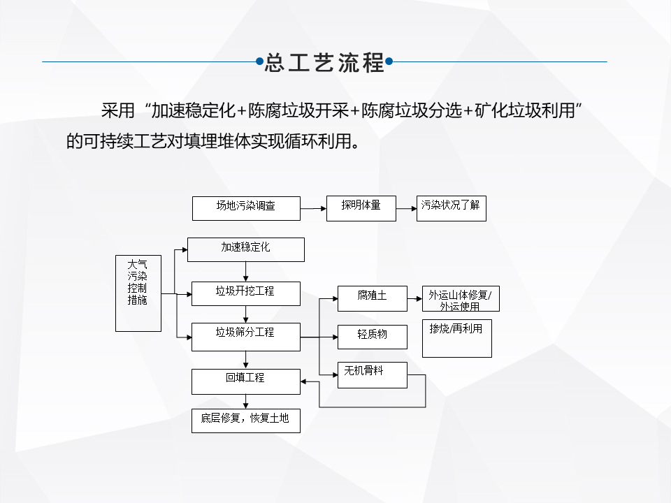 主要實現(xiàn)的目標是兩塊,一塊是從環(huán)境污染控制這一塊來說,另外一塊從占用大量的土地和庫容這塊來說。選擇工藝之前,比較重要的還是要前期做好調查和評估。像我們當時北京也是由宗正所在的科研所對全北京市的已有的已知的非正規(guī)的填埋場進行了整體的調查,調查完了以后,根據(jù)所有填埋場的庫容,它所在的位置,周圍跟底細水地表水的污染狀況,來進行評級。根據(jù)評級的情況來選擇不同的治理工藝,然后再進行分批實施。