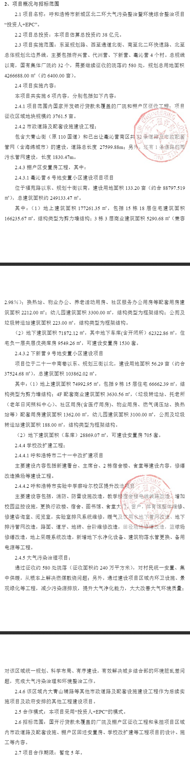 項目位于呼和浩特市新城區(qū),東至規(guī)劃路,西至通道北街,南至北二環(huán)快速路,北至總體規(guī)劃北邊界線,規(guī)劃總用地面積約4.3平方公里,擬采用 ABO+EPC 的運作模式實施,主要合作內(nèi)容包括廠院和棚戶區(qū)征收工程、市政道路及配套設(shè)施建設(shè)工程、棚戶區(qū)安置房工程及學(xué)校改擴建工程、大氣污染治理項目。