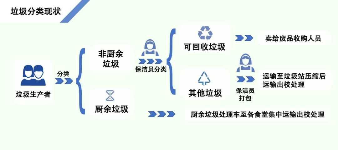 物業(yè)公司的張美婷分管一組團的宿舍樓棟工作,她在之前的巡視中觀察到很多垃圾未經(jīng)分類就扔在了桶里。她表示,宿舍樓棟垃圾在保潔員下班后確實存在堆積情況,但在工作時間內(nèi)能夠保證垃圾的清運,如果同學們丟棄的垃圾沒有分好類便會增加保潔員負擔。
