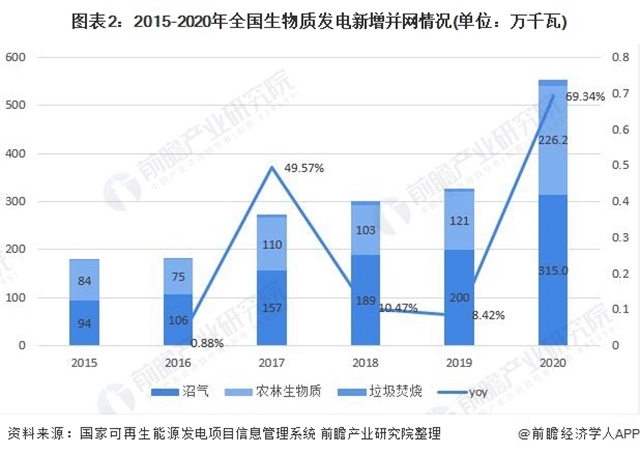 新增垃圾焚燒發(fā)電并網(wǎng)容量占比過半。根據(jù)國(guó)家可再生能源發(fā)電項(xiàng)目信息管理系統(tǒng)監(jiān)測(cè)數(shù)據(jù)顯示,2020年,全國(guó)生物質(zhì)發(fā)電新增并網(wǎng)容量553.6萬千瓦,同比增長(zhǎng)接近70%。其中,垃圾焚燒發(fā)電315.0萬千瓦,農(nóng)林生物質(zhì)發(fā)電226.2 萬千瓦,沼氣發(fā)電12.5萬千瓦。
