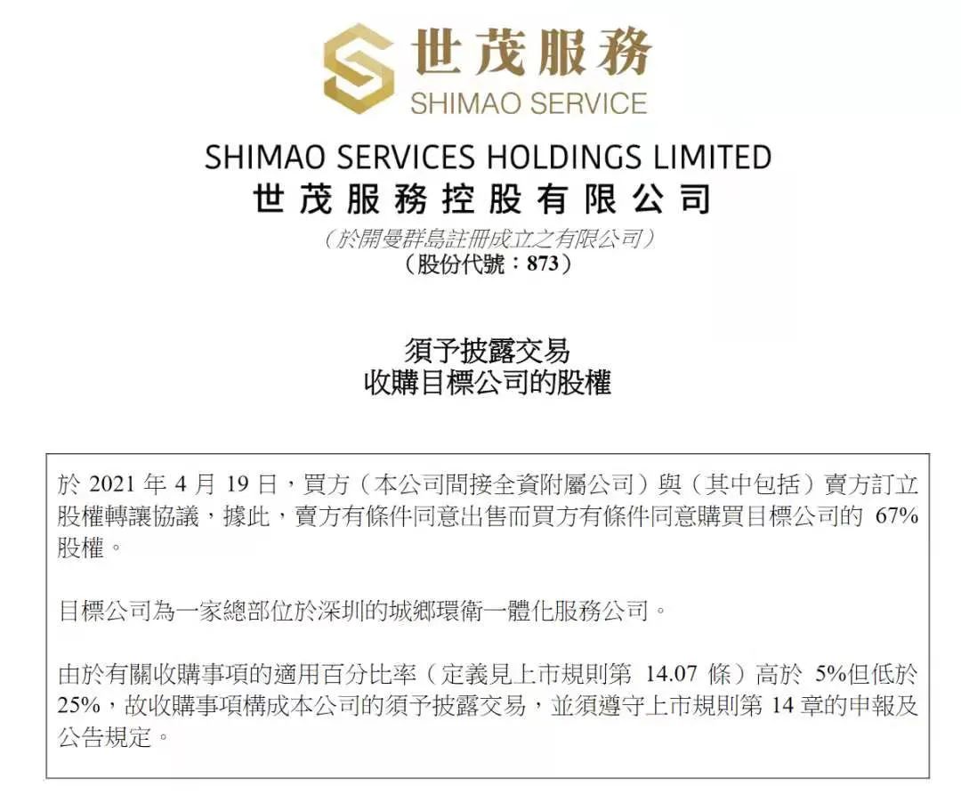 去年以來(lái),龍光智慧服務(wù)緊跟時(shí)代發(fā)展,加速擴(kuò)張腳步,樹(shù)立“城市綜合服務(wù)商”戰(zhàn)略定位。在戰(zhàn)略推動(dòng)下,龍光智慧服務(wù)提前卡位城市服務(wù)領(lǐng)域,成為橫琴首批7家物業(yè)城市戰(zhàn)略研究中心的副主任單位之一,在“物業(yè)城市”落地復(fù)制期擔(dān)任重要角色。此次,龍光智慧服務(wù)收購(gòu)奇嶺環(huán)境股權(quán),無(wú)疑對(duì)城市服務(wù)版圖擴(kuò)張具有重要的戰(zhàn)略意義。世茂服務(wù)擬5.06億元收購(gòu)深圳深兄環(huán)境67%股權(quán)4月19日,世茂服務(wù)發(fā)布公告稱(chēng),該公司擬以5.06億元的代價(jià)收購(gòu)深圳一家城鄉(xiāng)環(huán)衛(wèi)一體化服務(wù)公司。