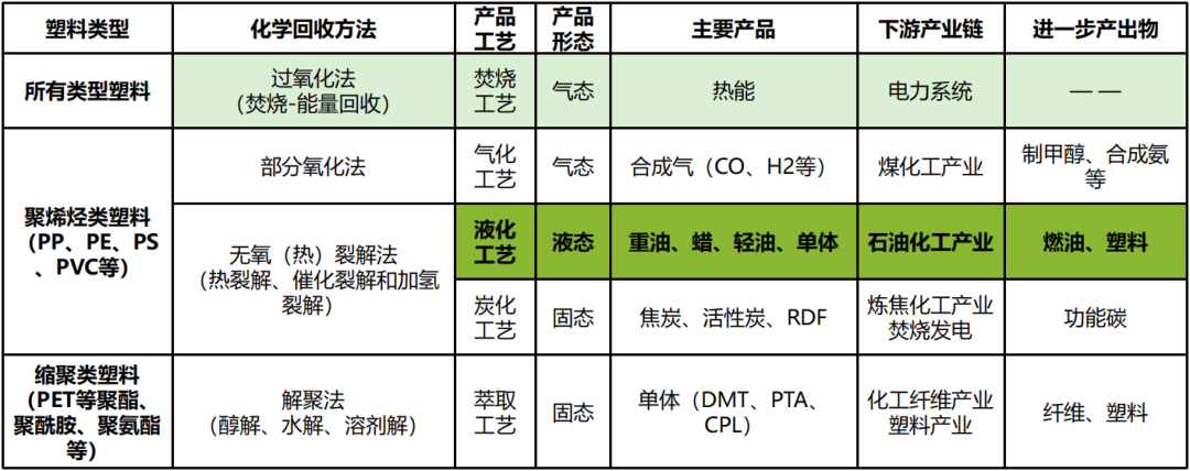 無氧裂解法:適用于聚烯烴類廢塑料,一是液化工藝,主要有熱解、催化裂解和加氫裂解三種類型,熱解一般產出重油和蠟,催化裂解可產出輕油,產出物均可導入石油化工制燃料或化工產品(如塑料);二是炭化工藝,可產出焦炭、活性炭或RDF,產品可導入煉焦化工制功能碳(如納米碳)。