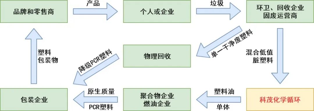 化學循環(huán)產業(yè)鏈:前端與傳統(tǒng)產業(yè)鏈相同,仍是從品牌商和零售商到消費者,再到環(huán)衛(wèi)、回收和固廢處理企業(yè)之后,低值的、混合的、受污染的塑料垃圾進入化學循環(huán),產出塑料油或者單體。