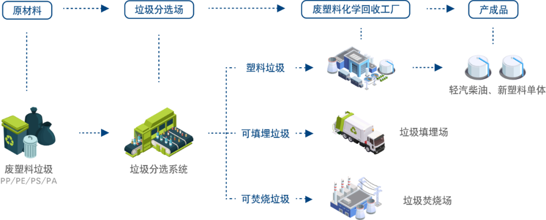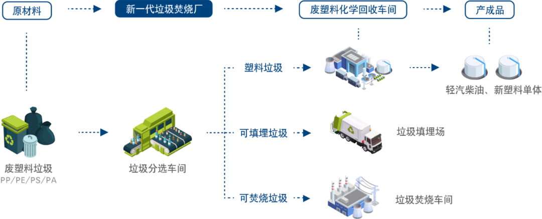 可能建立干垃圾、濕垃圾、裝修垃圾分選廠等,也有可能單獨在焚燒廠旁建分選廠,分選出垃圾中的高價值塑料做物理回收,混合低值廢塑料做化學回收,生成高價值塑料油或新塑料原料,剩下的垃圾通過焚燒或填埋處理。