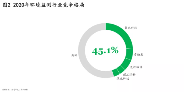 過去幾年內(nèi),國內(nèi)設(shè)備企業(yè)強(qiáng)勢擴(kuò)張,市場份額持續(xù)提升。外資企業(yè)雖有技術(shù)優(yōu)勢,但由于我國對相關(guān)設(shè)備國產(chǎn)化的支持,加之國內(nèi)企業(yè)自身的技術(shù)進(jìn)步,優(yōu)勢不斷下滑??梢钥吹?,為加快環(huán)境監(jiān)測設(shè)備國產(chǎn)化步伐,國家出臺多項政策,如《空氣質(zhì)量新標(biāo)準(zhǔn)第二階段監(jiān)測實施方案》、《生態(tài)環(huán)境監(jiān)測網(wǎng)絡(luò)建設(shè)方案》等,鼓勵國內(nèi)科研部門和相關(guān)企業(yè)研發(fā)具有自主知識產(chǎn)權(quán)的環(huán)境監(jiān)測儀器設(shè)備,規(guī)定政府在滿足需求的條件下優(yōu)先使用國產(chǎn)設(shè)備。第三方運維企業(yè)以小規(guī)模居多,受數(shù)據(jù)造假、運維不規(guī)范、信任危機(jī)等一系列問題影響,部分被淘汰出局。截至2020年,我國環(huán)境監(jiān)測CR5為45.1%(如圖2),行業(yè)集中度較高。